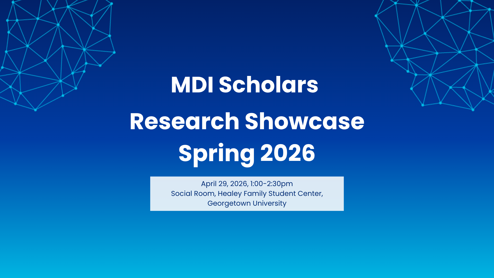 On Wednesday, April 29, 2026, the Massive Data Institute of the McCourt School of Public Policy will host the MDI Scholars Research Showcase Spring 2026. MDI Scholars will present their research in the Healey Family Student Center Social Room at Georgetown University from 1:00-2:30 pm, followed by a reception.