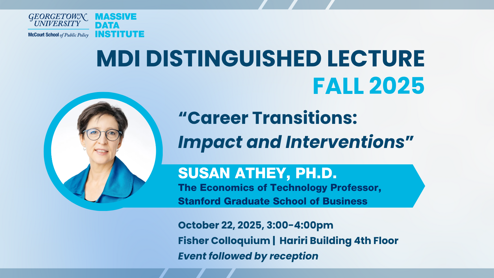 On October 22, 2025 from 3:00-4:00pm at Fisher Colloquium, the McCourt School of Public Policy’s Massive Data Institute (MDI) will host Susan Athey, Ph.D., Economics of Technology Professor at…